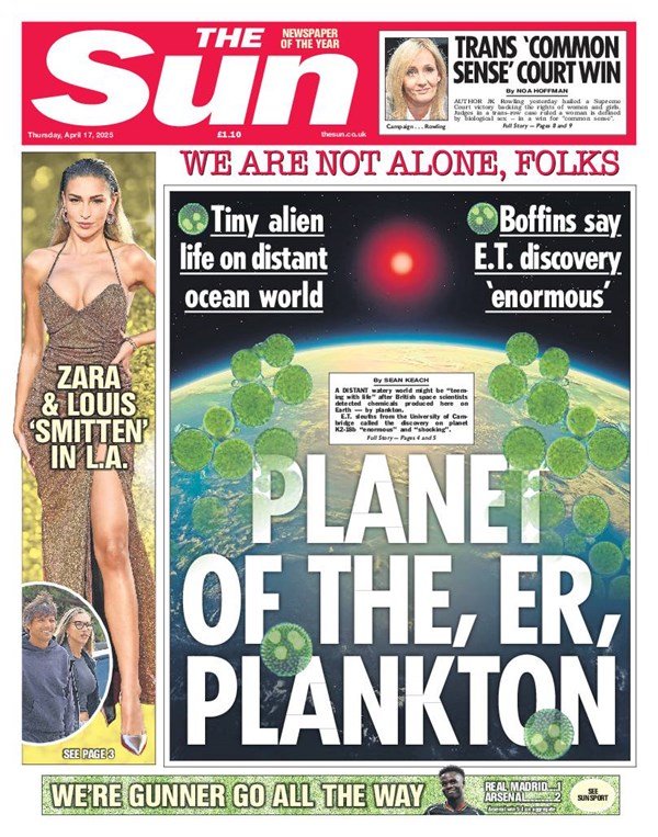 Ik vroeg me af hoe deze video aan zijn titel kwam, tot Van den Berg vertelde dat áls je op een verre planeet luchtvervuiling van fabrieken zou vinden, je dan zeker weet dat je met aliens te maken hebt. En dat wordt dan de titel van de video, chapeau. De berichtgeving in De Telegraaf was overigens nog ingetogen vergeleken met de Britse krant The Sun die bijna de hele voorpagina inruimde voor ‘Planet of the plankton’ en koppen als: ‘Boffins say E.T discovery ‘enormous’’.